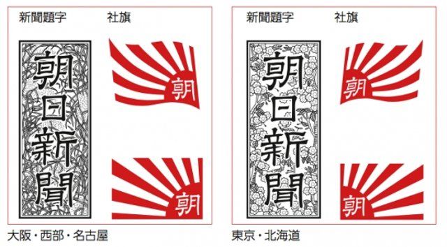 오사카 아사히 신문과 도쿄 아사히 신문은 1940년 완전히 합병했다. 하지만 신문사의 깃발은 여전히 두 개로 나뉘어져 있다. 오사카 아사히 신문의 깃발은 붉은 태양과 회사명을 나타내는 글자(朝)가 오른편 하단에 위치해 있고 반대로 도쿄 아사히 신문의 깃발에서는 이 것들이 왼편 하단에 위치한다. 두 깃발을 합쳐 놓고 보면 욱일기의 절반에 해당되는 윗부분과 일치한다.