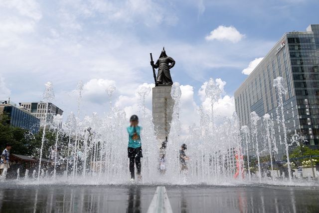 무더위가 이어지고 있는 가운데 서울 세종대로 광화문광장 분수대를 찾은 아이들이 더위를 식히고 있다. 기사 이해를 돕기 위한 자료 사진.광복절인 15일 오전 11시를 기해 서울과 대전 등 중부지방 대부분에 폭염주의보가 발령됐다. 서울은 지난 6일 오전 4시 폭염주의보가 해제되고 9일 만의 재발령이다. / 뉴스1