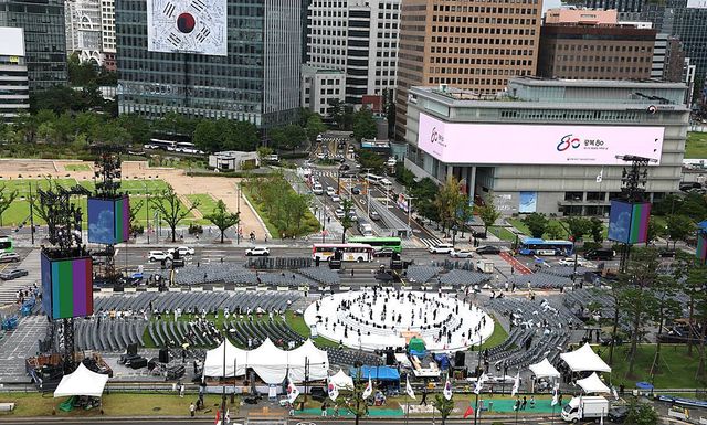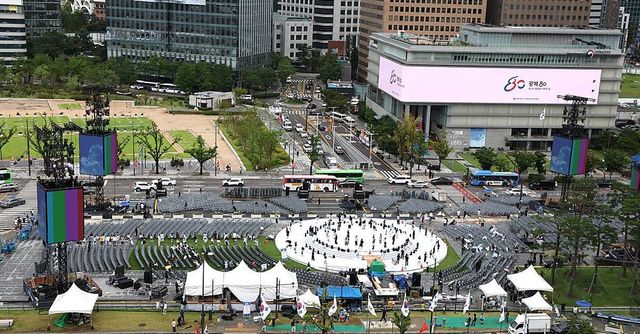 지난 14일 오후 서울 광화문 광장에 설치된 '광복 80년, 국민주권으로 미래를 세우다' 국민대축제 무대에서 관계자들이 리허설을 하고 있다 / 뉴스1