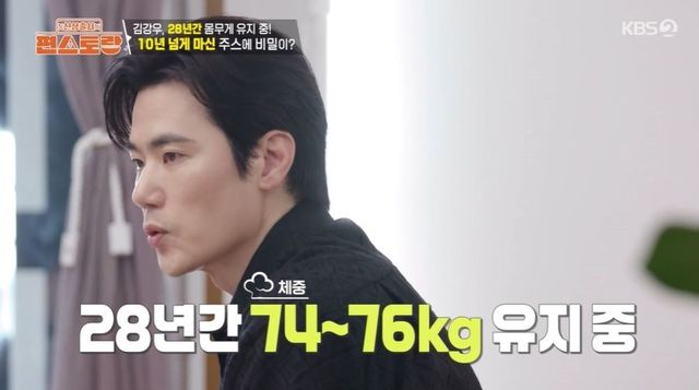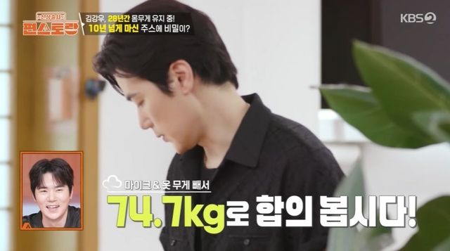 평소 관리를 열심히 하는 김강우는 “제가 어느 인터뷰에서 몸무게가 고등학교 때랑 똑같다고 말씀드렸다. 제가 고등학교 때 74kg이었더라”면서 28년간 몸무게 74~76kg을 유지하고 있다고 밝혔다. 제작진이 몸무게를 재보자며 체중계를 들고 오자 김강우는 “지금 옷 입고 있지 않냐. 지금 물을 많이 마셨다”라며 화장실에 다녀왔다.