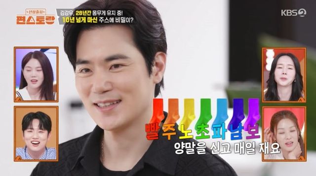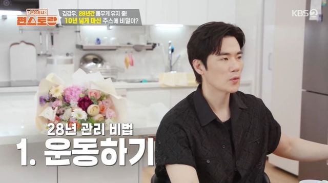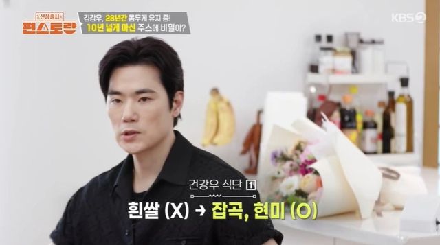 김강우는 한결같은 몸무게 유지 비법으로 “운동하고, 식단 관리는 흰색만 안 먹으면 된다. 흰쌀밥, 흰빵”이라며 “흰쌀밥을 잡곡이나 현미로 바꾸고, 빵은 잡곡빵을 먹는다”라고 철저한 관리를 하고 있다고 밝혔다. 또한 김강우는 “라면은 1년에 2번 먹는다”라며 “아침엔 제가 10년 넘게 만들어 먹는 게 있다”라며 ’10년 삭제 주스’ 레시피를 공개했다. 김강우는 머리숱도 자랑하며 “아직 안 심었다. 가발 아니다”라고 밝혔다.