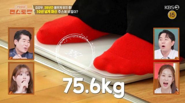 양말도 빨간 색깔로 갈아입고 온 김강우는 “제가 원래 빨주노초파남보 양말을 매일 신고 쟀다. 기록을 남기는데 눈에 확 보이게 해봤다”라고 설명했다. 김강우는 “화장실에 다녀오길 정말 잘했다”라고 뿌듯해하며 체중계로 올라갔다. 몸무게는 75.6kg으로, 김강우는 “뒤에 차고 있는 마이크가 상당히 묵직하다. 1kg 정도 나가니까 지금 정도면 74.7~74.8kg 될 것 같다”고 너스레를 떨었다.