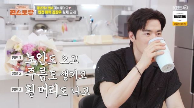 제작진이 “이걸 먹으면 10년 젊어질 수 있겠네요?”라고 하자 김강우는 “이거 먹고 술 먹고 담배 피면 아무 의미 없죠”라며 “전 담배는 결혼하면서 끊었다. 아이를 보니까 안 피게 되더라. 술은 집에서 아내랑 마신다”면서 15년째 금연 중이라고 밝혔다.
