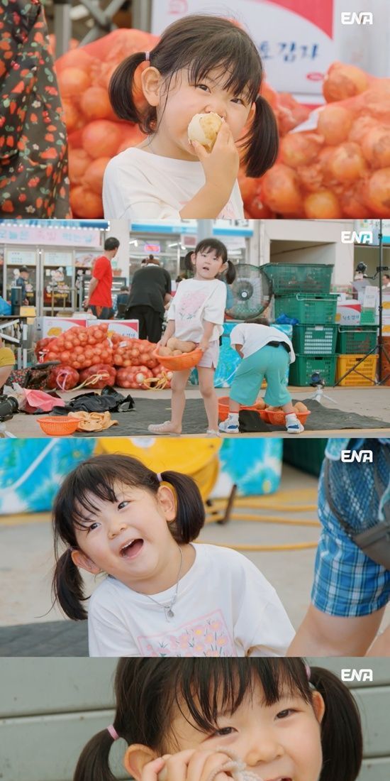 이날 도아와 승유는 아침부터 직접 캔 감자를 들고 시장으로 향한다. 평소 ‘시장 놀이’로 다져진 내공 덕분인지 감자 홍보까지 척척해내는 도아. 심지어 찐 감자를 들고 즉석 먹방까지 선보이며 손님들의 발길을 붙잡는다. 또한 아이들의 귀여운 애교에 손님들과 상인들 모두 웃음꽃을 피운다.
