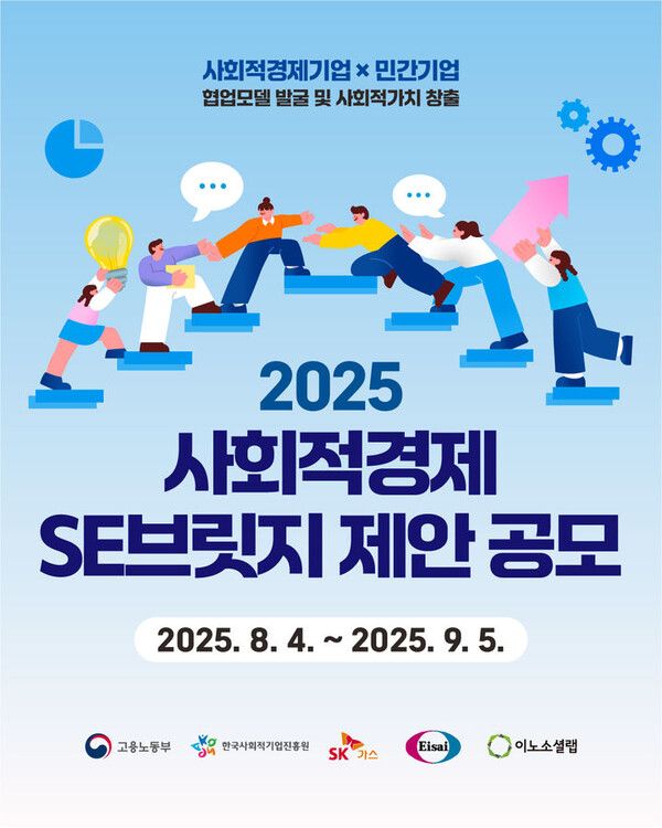 2025 사회적경제 SE브릿지 공모는 사회적기업·협동조합·마을기업·자활기업·소셜벤처 등 사회적경제기업을 대상으로 한다. 신청은 내달 5일까지이다. 진흥원 홈페이지 공고문에서 신청서와 제안서를 내려받아 작성·제출하면 된다. 최종 선정 결과는 11월 중 발표된다.