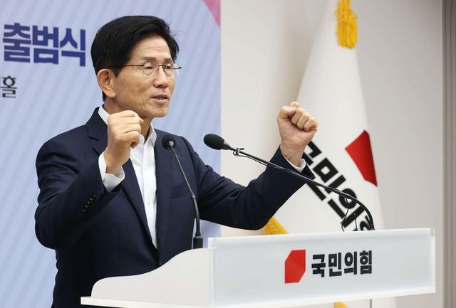 김문수 국민의힘 당대표 후보가 15일 오후 서울 여의도 중앙당사에서 열린 2025원외당원협의회 운영위원장 협의회 출범식에서 발언하고 있다. / 뉴스1