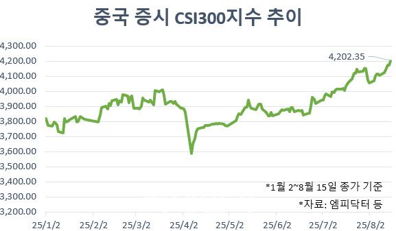 17일 엠피닥터 등에 따르면 지난 15일 중국 증시의 벤치마크 지수인 CSI300지수는 4202.35)로 4200선을 돌파하며 올해 최고 기록을 다시 세웠다.
