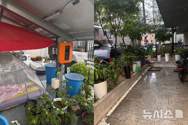 공개된 사진에는 A씨가 사는 건물 곳곳의 모습이 담겼다. 화분으로 둘러싸인 주차장, 한쪽을 차지하고 있는 물이 담겨있는 커다란 욕조, 대야, 페인트 통 등이 보였다.