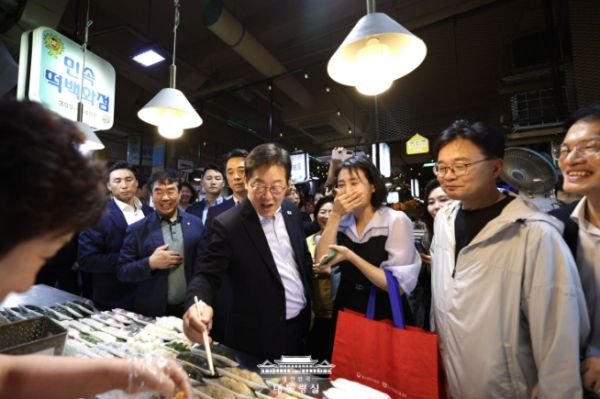 시장 곳곳을 둘러보는 동안 상인들은 이 대통령 내외에게 앞다퉈 먹거리 시식을 권했고, 이 대통령은 순대, 떡볶이, 튀김, 떡 등을 직접 구매해 김혜경 여사와 대통령실 참모들과 함께 나누어 먹었다.