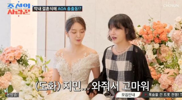 한편 이날 방송에선 임도화 송의환 부부의 결혼식 풍경도 공개됐다. 이날 설현, 혜정 등이 결혼식장을 찾은 가운데 마지막 지민의 방문에 이르러 임도화는 “와줘서 고맙다. 나 언니 보니까 울 것 같다”라며 울컥한 반응을 보였다. 임도화의 어머니 역시 지민과 포옹을 하며 특별한 정을 나눴다.