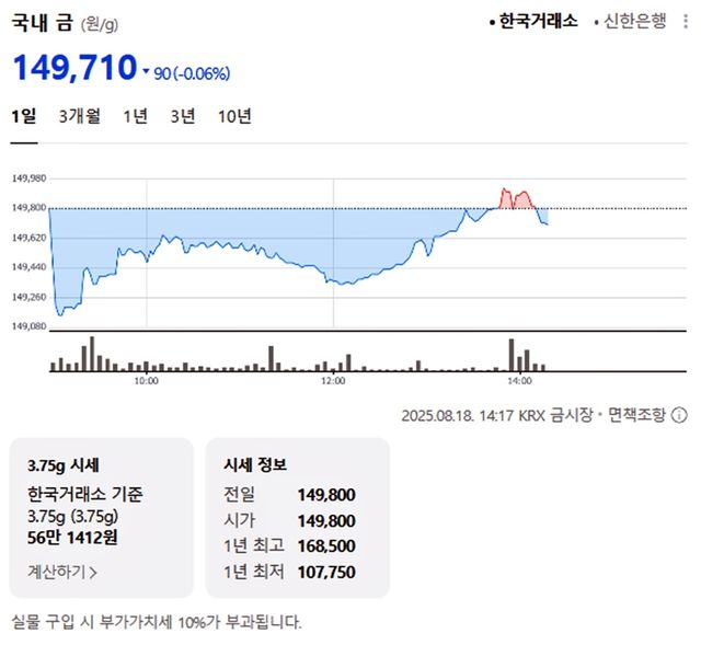 국내 금시세(금값)가 18일(한국 시각) 오후 하락세(전 거래일 대비)를 보이고 있다.