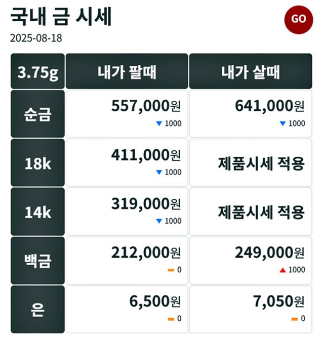 순금(24K) : 매입가 64만 1000원 / 매도가 55만 7000원