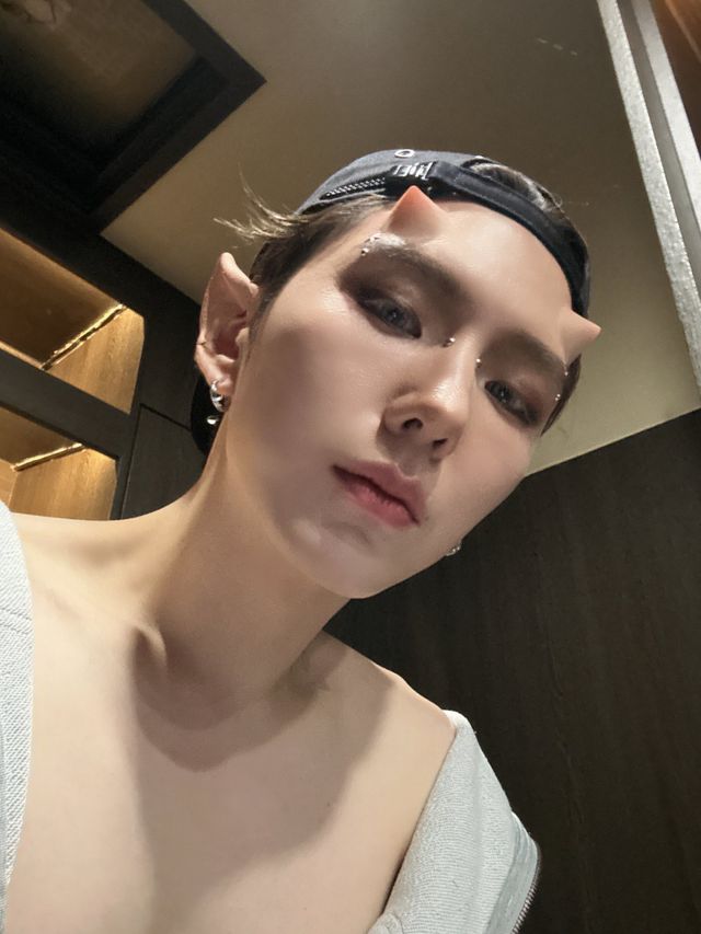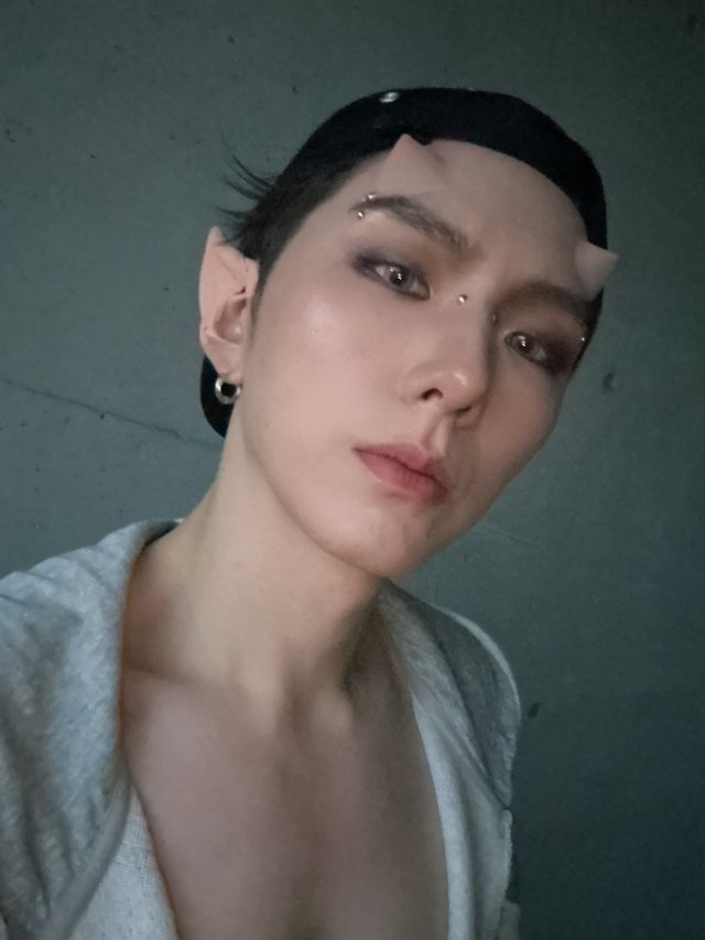 사진 속 그는 뮤직비디오 콘셉트에 맞춰 도깨비로 변신하는 과정을 선보였다. 이마에는 도깨비의 뿔을, 귀에는 고블린의 뾰족한 분장을 더했다. 힙한 피어싱과 독특한 컬러 렌즈로 오묘한 느낌까지 더했다.