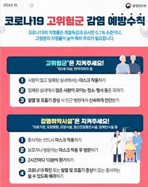 특히 고령층이나 면역저하자 등 고위험군에게는 사람이 많고 밀폐된 실내 행사 참여를 자제하고, 부득이 참여하는 경우 마스크를 착용하며, 발열 및 호흡기증상 발생 시에는 신속하게 진료를 받을 것을 강조했다.