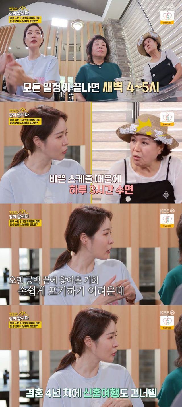 이날 미자는 자신의 바쁜 하루 일정을 이야기했다. 요즘 본업이 쇼호스트라고 밝힌 미자는 "홈쇼핑하고 유튜브도 찍고 집에 오면 새벽 4~5시다. 잠을 하루 3시간 정도 잔다"라고 고백해 모두를 놀라게 했다.