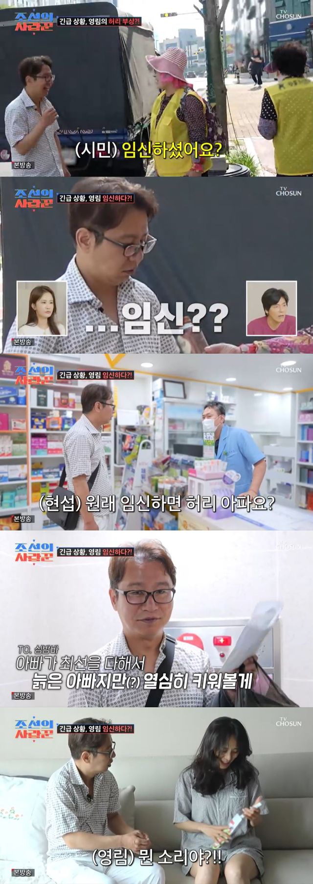 이를 들은 심현섭은 "어른들 말은 다 백발백중인데?"라며 곧장 약국으로 향했다. 약국으로 가 약사에게 "원래 임신 하면 허리 아프냐"는 질문을 던진 그는 이내 임신테스트기를 구매했다.