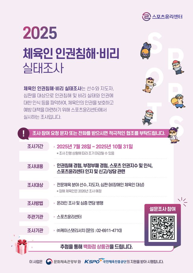 스포츠윤리센터는 "이번 2025년 체육인 인권침해‧비리 실태조사를 통해 체육인의 목소리에 귀를 기울이고, 체육계 현장의 고충을 최대한 반영하여 보다 나은 스포츠 윤리 문화 확립을 위해 힘쓰겠다"라고 덧붙였다.