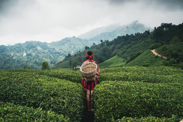 튀르키예 리제 지방의 테라시스 언덕을 바라보며 흑차 농장 사이에 서 있는 사람의 모습. / macondo-shutterstock.com