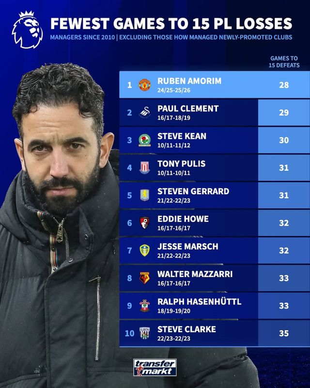 후벵 아모링 맨체스터 유나이티드 감독이 2010년대 잉글랜드 프리미어리그(EPL) 역사상 ‘최단 기간’ 15패에 도달한 사령탑이 됐다.
