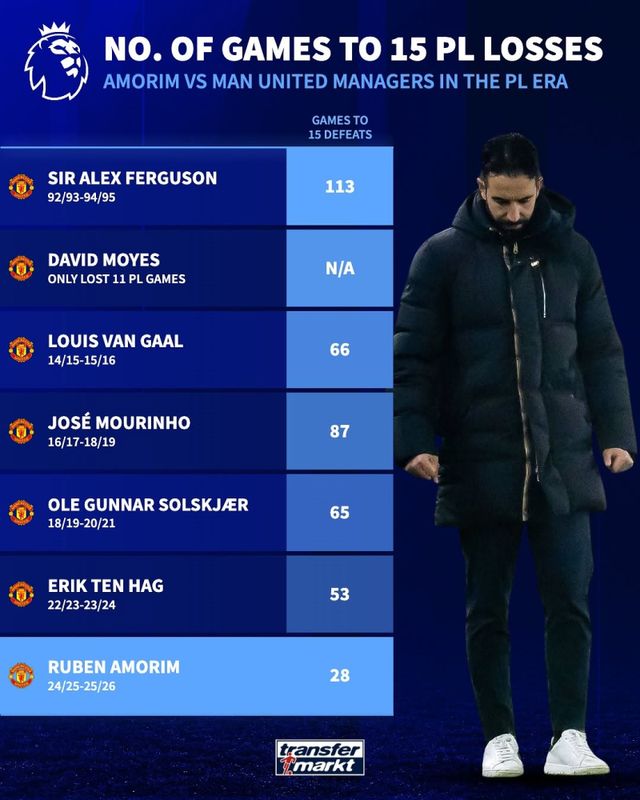 20년 넘게 팀을 이끈 알렉스 퍼거슨 전 감독은 113번째 리그 경기에서 15패에 도달한 바 있다.