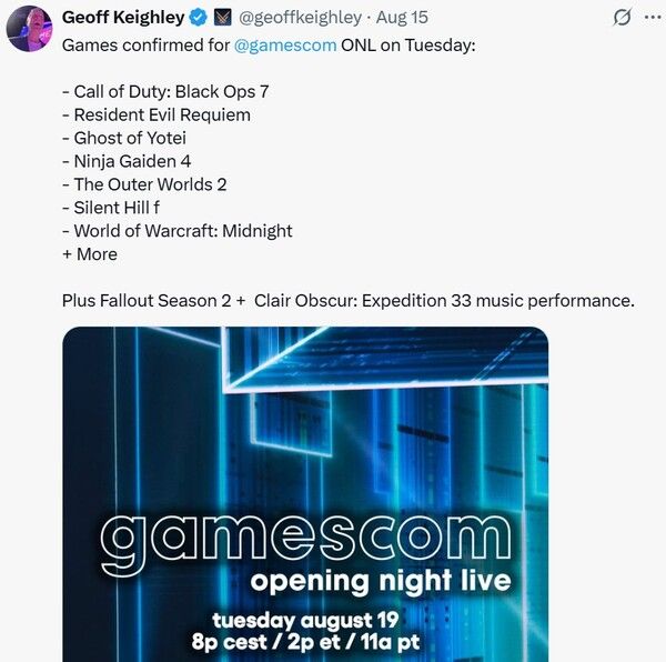 쇼 호스트 제프 키엘리니가 X를 통해 공개한 라인업에 따르면 ‘바이오하자드 레퀴엠’ , ‘콜 오브 듀티 블랙옵스7’, ‘고스트 오브 요테이’, ‘닌자 가이덴4’, ‘아우터 월즈2’, ‘사일런트 힐 F’, ‘월드 오브 워크래프트: 한밤’이 정보를 공개한다.