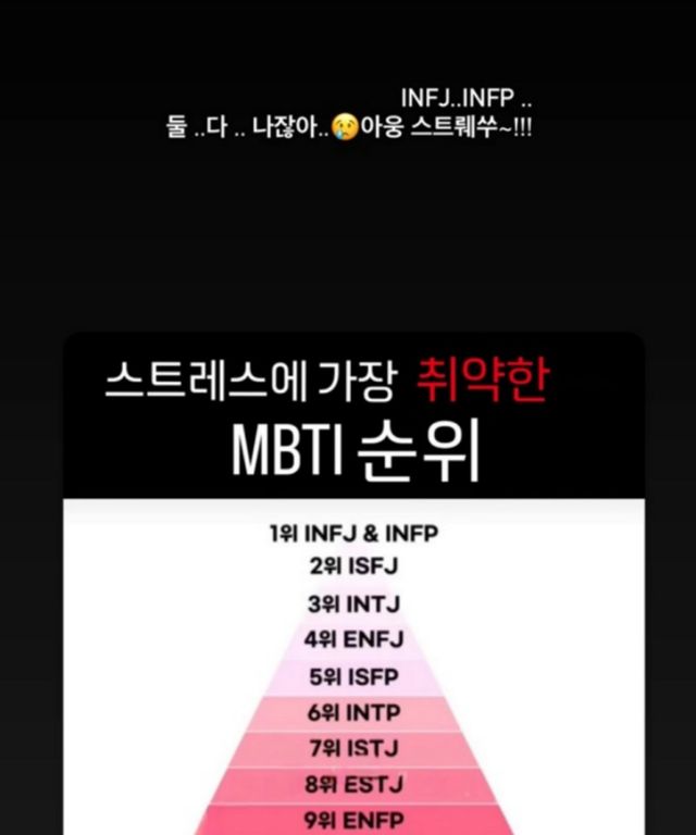 윤은혜는 19일 자신의 계정에 “INFJ, INFP 둘 다 나잖아. 아웅 스트레스”라을 게재했다. 함께 게재된 사진에는 ‘스트레스에 가장 취약한 MBTI 순위’가 피라미드로 정렬돼 있다.