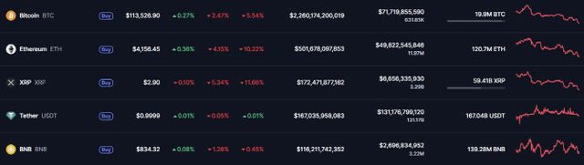 글로벌 가상자산 시황중계 사이트 코인마켓캡에 따르면 20일 오전 5시 55분 기준 비트코인 가격은 24시간 전 대비 2.47% 내린 11만 3526달러를 기록했다. 일주일 전과 비교하면 5.54% 내렸다. 이더리움은 전일 대비 4.15% 하락한 4156달러에 거래됐다.