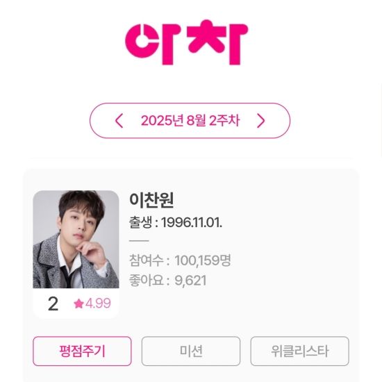 최근 아이돌차트에 따르면, 8월 2주 차 평점랭킹에서 이찬원이 2위를 기록했다.