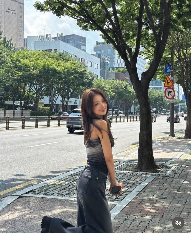 특히 살짝 입술을 깨무는 표정은 소녀다운 청순미와 동시에 치명적인 매력을 드러냈다. 카메라를 응시하는 도도한 눈빛과 해맑게 웃는 미소가 공존해, 도심 배경마저 런웨이처럼 바꿔버린 듯한 아우라를 완성했다.