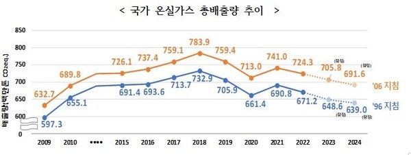 이는 파리협정에 따라 바뀐 기준인 '2006 기후변화에 관한 정부간 협의체 산정지침(2006 IPCC 지침)'을 적용해 산출한 값으로, 과거 기준인 1996 IPCC 지침을 적용하면 2024년도 총배출량은 6억3897만t이다.