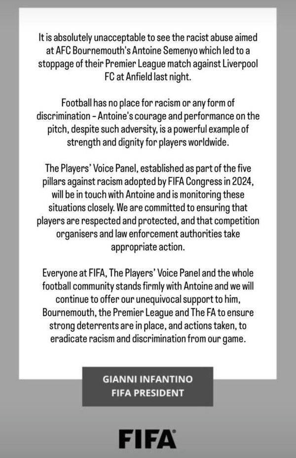 FIFA에 따르면 인판티노 회장은 “세메뇨를 겨냥한 인종차별적 학대는 절대 용납할 수 없다”라며 “축구에는 인종차별이나 어떤 형태의 차별도 용납될 수 없다. 이러한 역경 속에서도 경기장에서 보여준 앙투안의 용기와 활약은 전 세계 선수들에게 힘과 존엄성을 보여주는 강력한 사례”라고 힘주어 말했다.