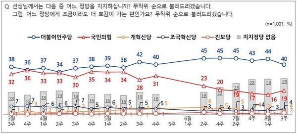 직전 조사(8월1주차) 대비 민주당 지지도는 4%포인트 떨어졌고 국민의힘 지지도는 3%포인트 올랐다.