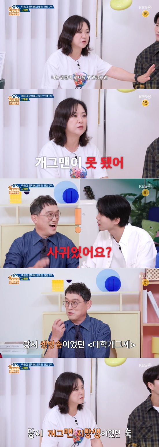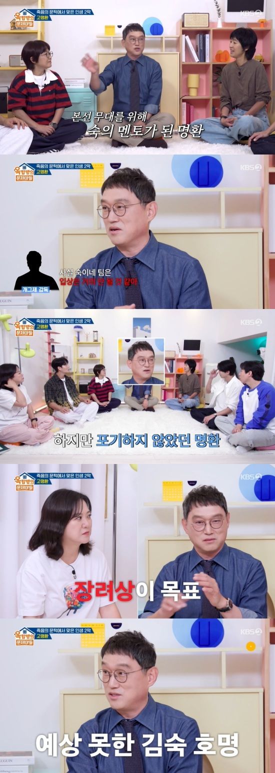 고명환은 "그 때 '대학개그제'는 생방송으로 나왔다. 김숙 씨는 1년 후배로 왔는데, 그 땐 지망생이었다"며 "본선을 해야하는데, 그래서 우리를 붙여줬다. 방송용 대본으로 다듬어주라는 거였는데, 그 때 감독님이 '사실 숙이네 팀은 입상은 안 될 것 같다'고 했었다"고 이야기했다.