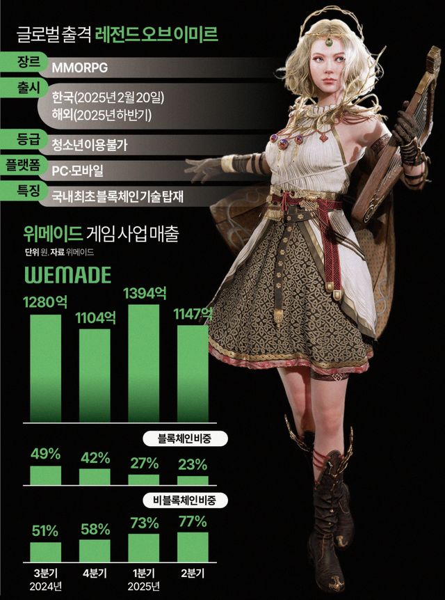 블록체인은 업계 선구자를 자부하는 위메이드의 주요 수익원이다. 지난 2024년 3분기와 4분기 위메이드의 게임 사업 부문 매출에서 블록체인 게임이 차지하는 비중은 각각 49%, 42%로 절반에 가까웠다. 올해 들어서는 20%대로 떨어졌다.