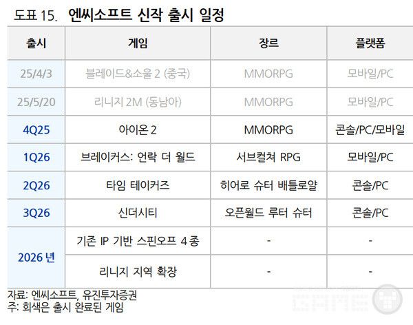 엔씨소프트의 신작 라인업에서도 아이온2의 중요성이 부각된다. 2026년 가이던스 달성에 있어 변수는 신작 성과이며, 8종의 신작(스핀오프 4개 포함)으로 최소 6천억원의 매출을 달성해야 하는데, 이 중에서도 핵심은 아이온2의 성과라고 분석됐다.