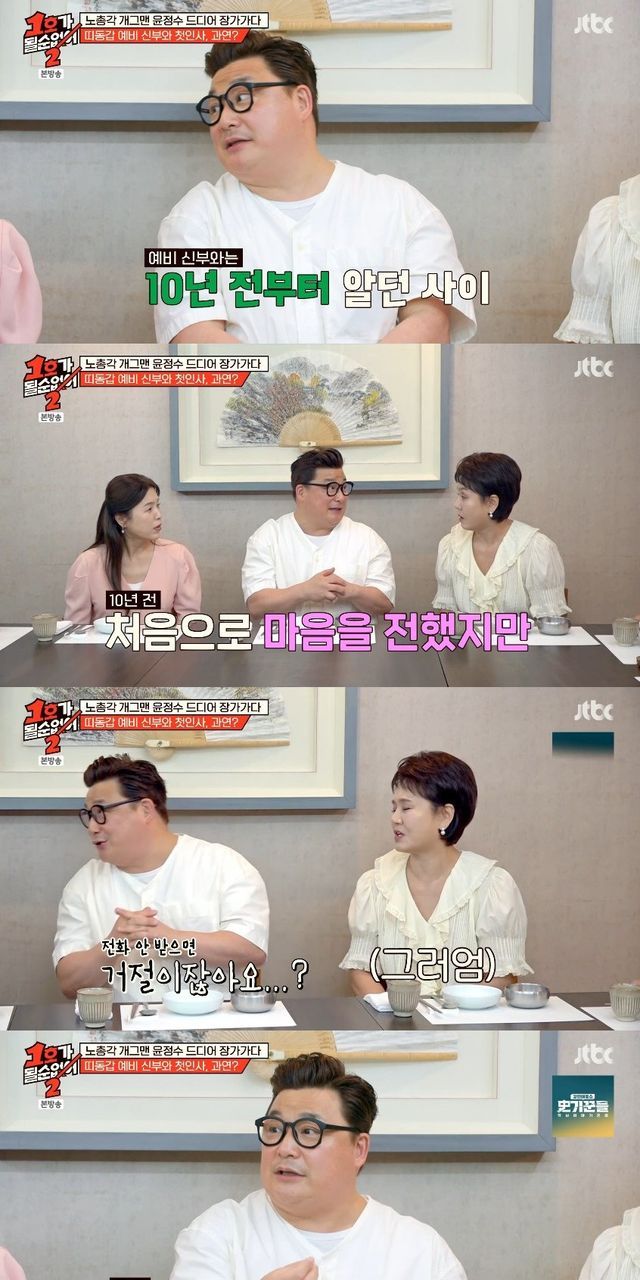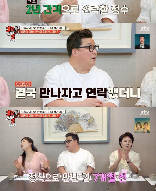 21일 방송된 JTBC '1호가 될 순 없어2'에서는 윤정수가 팽현숙 최양락 부부와 임미숙 김학래 부부, 그리고 이경실과 김지선을 초대해 결혼을 발표, 12세 연하 아내를 공개했다.