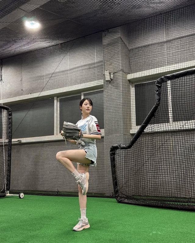 공개된 사진 속 장다아는 유니폼 끝을 자연스럽게 묶은 채 짧은 데님 쇼츠를 매치해 자신만의 '시구 룩'을 선보였다.