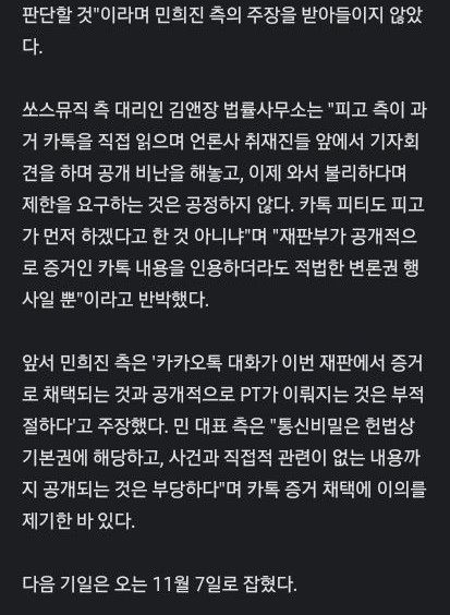 쏘스뮤직vs민희진, 카톡 증거 채택됐다 공개PT없이 구술변론진행