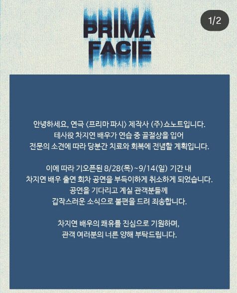 22일 공연 제작사 쇼노트는 공식 SNS를 통해 “태사 역의 차지연 배우가 연습 중 골절상을 입어 전문의 소견에 따라 당분간 치료와 회복에 전념할 계획”이라고 밝혔다.
