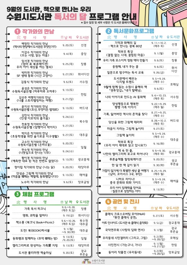 수원시 관계자는 “독서의 달을 맞아 마련한 다양한 문화 체험 프로그램에 참여해 책 읽는 즐거움을 느끼길 바란다”며 “시민들이 프로그램에 참여하며 서로의 생각을 나누는 유익한 시간이 보낼 수 있을 것”이라고 말했다.