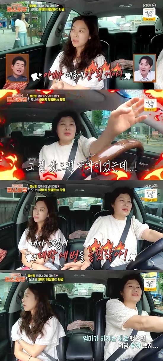 이때 장신영 모녀의 뒷담 퍼레이드(?)가 시작됐다. 장신영이 "아빠는 겁쟁이다. 우리 집은 아빠 때문에 안 된 거다"라고 말문을 열자 어머니는 "뭘 하는 것도 안 되고 투자도 안 되고 다 안 된다"며 "성수동 그 집 샀으면 대박인데"라고 아쉬워했다.