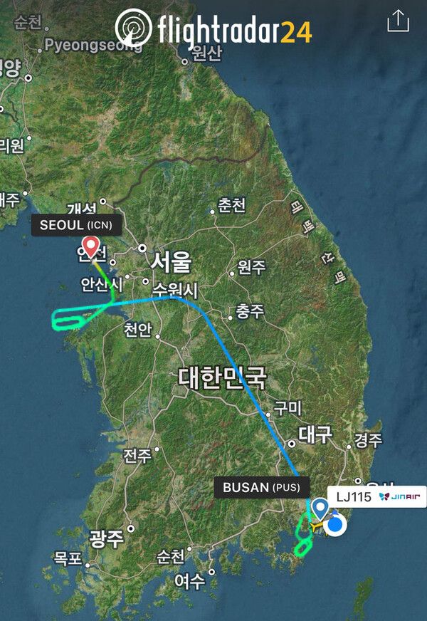 해당 항공기는 경남 거제도 인근과 충남 당진시 인근에서 연료를 소진하는 작업을 한 뒤 인천국제공항으로 회항했다.