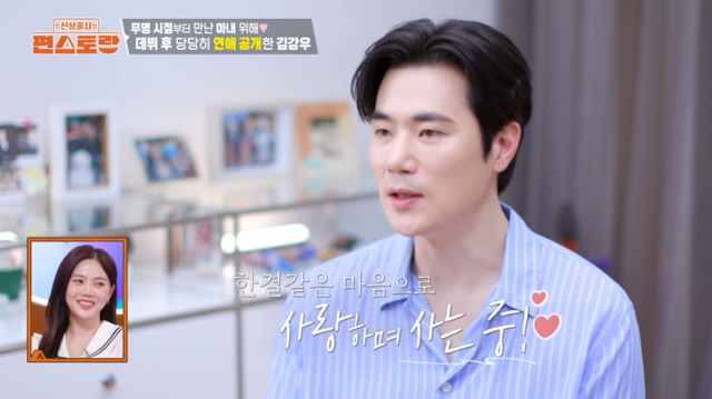 아내와 연애를 시작한 김강우는 당시 무명배우로 오디션을 보러 다녔었다. 이후 스타덤에 오르자마자 아내와 열애 사실을 화끈하게 공개한 김강우는 "소속사에선 '굳이'라고 했지만 내가 공개해버렸는데 어쩔 거냐"라고 말했다.