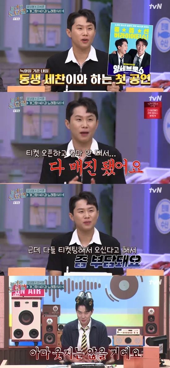 이어 붐은 양세형에게 "세형 씨는 좋은 일이 있다고? 콘서트 계획이 있다고 들었다"라고 물었다. 양세형은 "동생이랑 저랑 처음으로 공연을 한다. 감사하게도 많이들 궁금하셨는지 티켓 오픈하고 얼마 안 돼서 매진됐다"라며 기쁜 소식을 전했다.