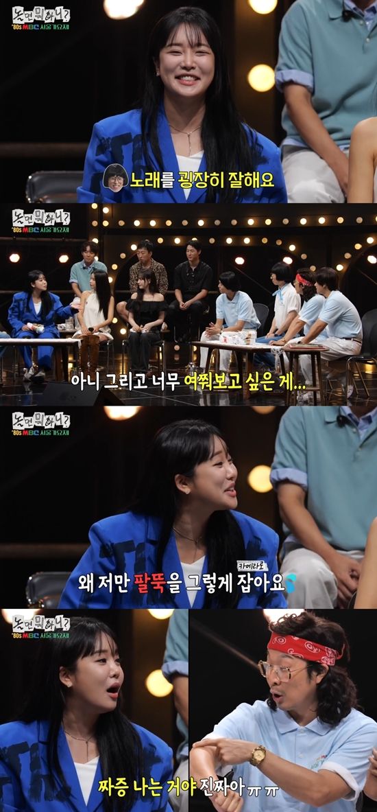 이어 유재석은 랄랄을 "노래를 굉장히 잘한다"라고 소개했다. 196만의 구독자를 거느리고 있는 랄랄은 "여쭤보고 싶은 게 있는데 저만 그렇게 팔뚝을 (카메라로) 잡냐"라며 불만을 토했다. 지난 예선에서 랄라의 팔뚝이 강조됐던 것.