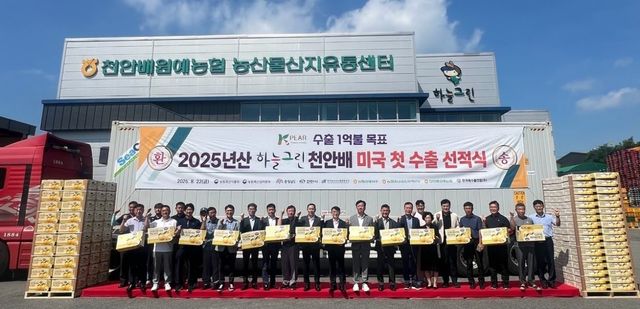 천안시는 지난 22일 천안배원예농협 농산물산지유통센터에서 '2025년산 하늘그린 천안배 수출 선적식'을 열고 조생종 '원황' 품종 배 13.6톤(6700만 원 상당)을 선적해 미국으로 보냈다.