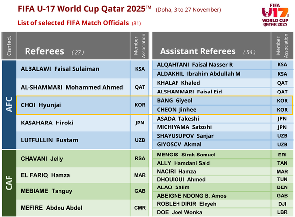 [풋볼리스트] 김희준 기자= 국제축구연맹(FIFA)이 오는 11월 카타르에서 열리는 17세 이하(U17) 월드컵 심판진 명단 구성을 마무리했다. 한국에서는 주심 1명과 부심 2명이 심판진 명단에 이름을 올렸다.