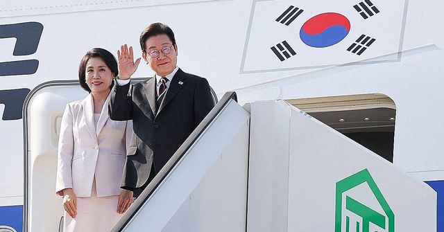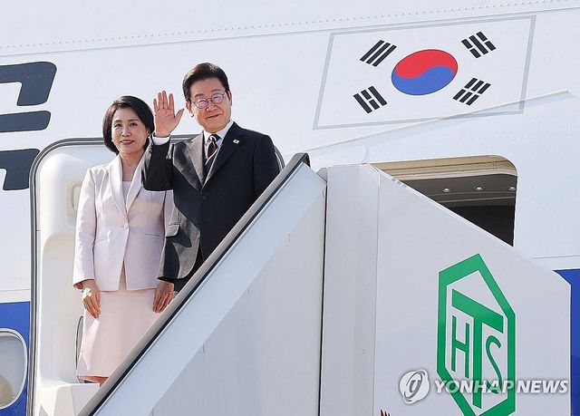 한일 정상회담을 마친 이재명 대통령과 부인 김혜경 여사가 24일 일본 도쿄 하네다공항에서 도널드 트럼프 미국 대통령과의 한미 정상회담을 위해 워싱턴DC로 향하며 공군1호기에 올라 인사하고 있다 / 연합뉴스