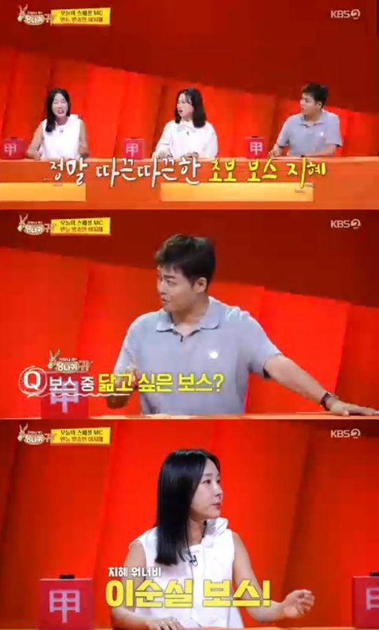 이지혜는 닮고 싶은 보스로 이순실을 꼽으면서 "기운 자체가 호랑이 기운이시다. 추진력, 파이팅 이런 걸 닮고 싶다"고 전했다.