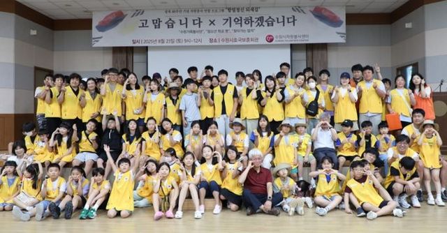 수원시자원봉사센터는 23일 수원시보훈회관에서 가족봉사단, 청소년자원봉사학교 초·중학생 120여 명은 김호동 광복회 경기도지부장의 광복 80주년 특강 ‘그리 오래되지 않은 이야기’를 듣고 독립유공자 후손들에게 감사 편지 쓰기와 선물 포장과 스티커 붙이기 등을 진행했다.